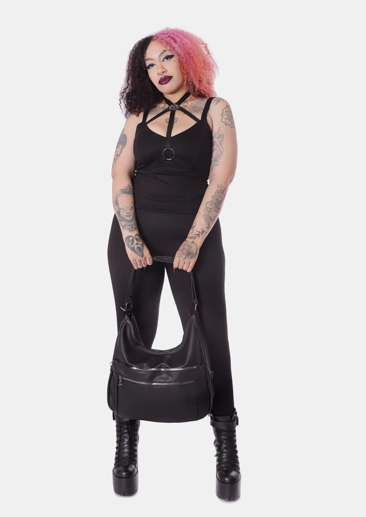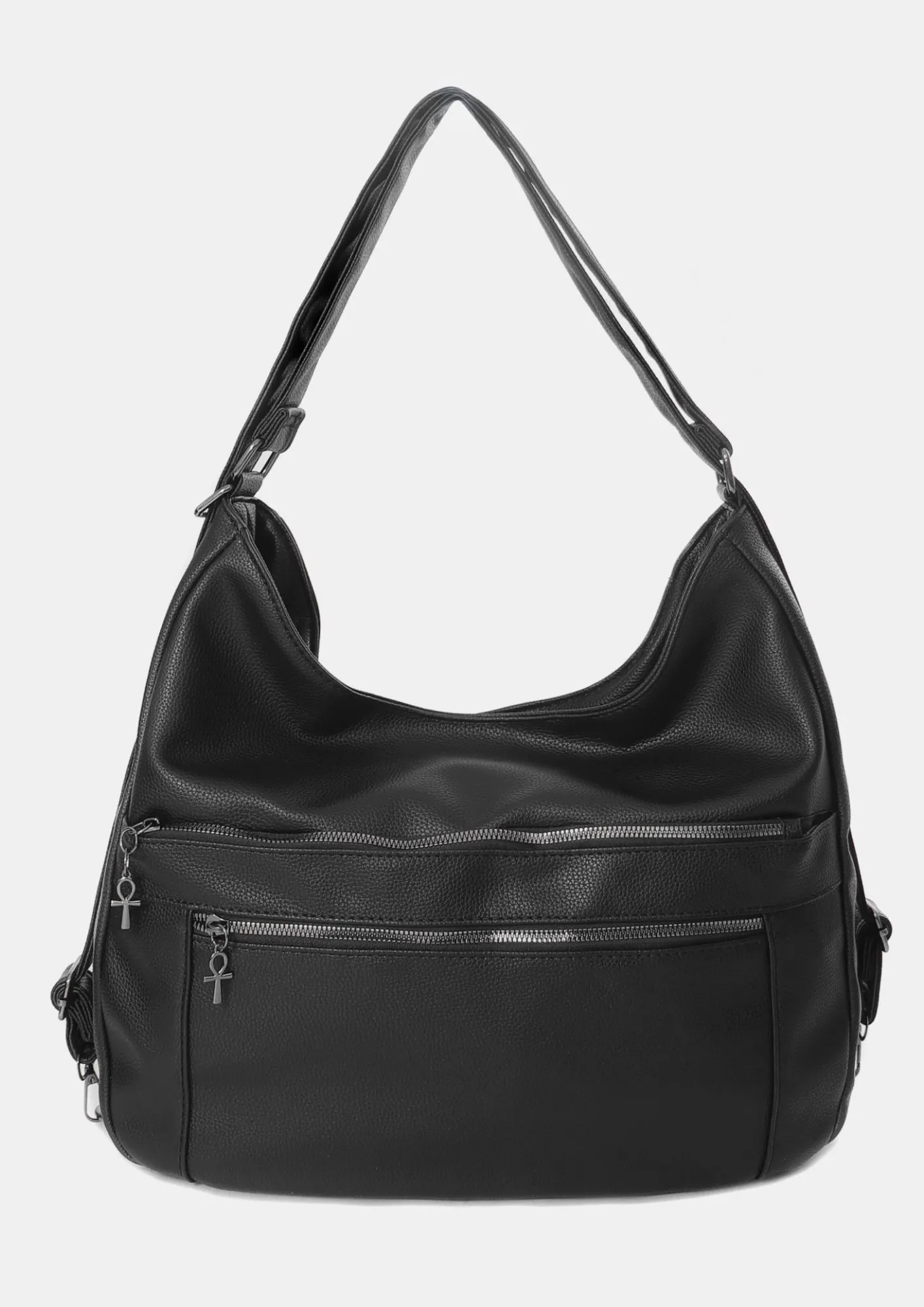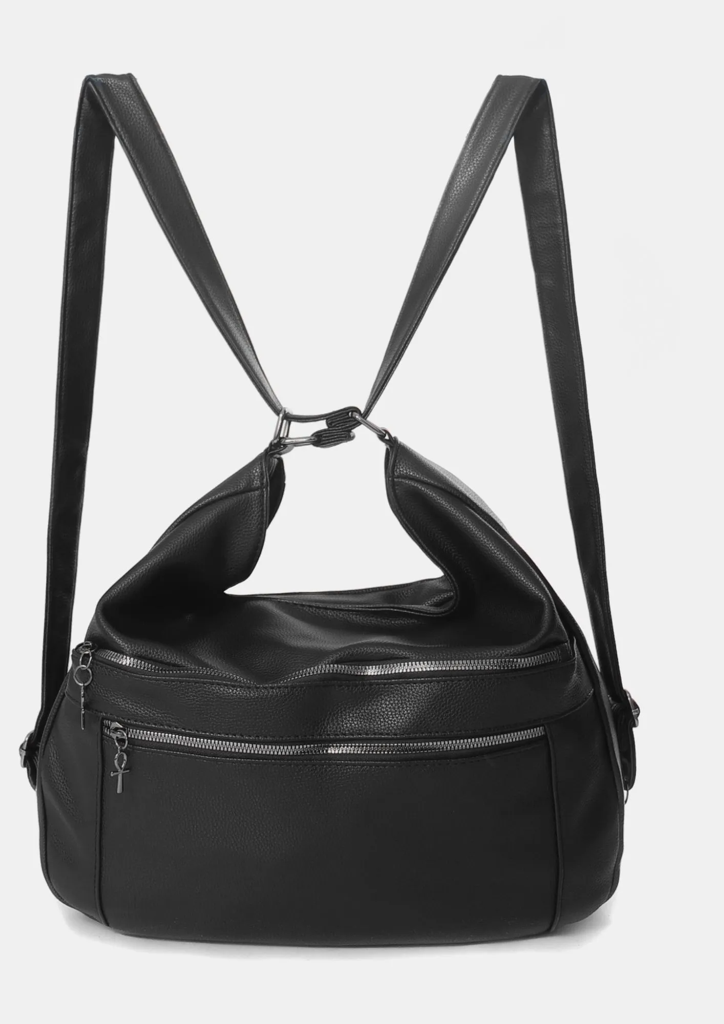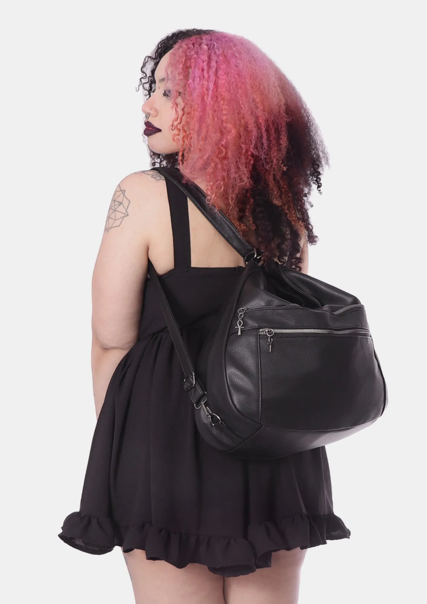 Capaz de guardar absolutamente tudo o que você precisa para um dia intenso, suas alças versáteis transformam a bolsa de ombro em mochila com apenas uma puxadinha. Prática, estilosa e cheia de personalidade, ela ainda possui pingentes de ankh nos zíperes, reforçando a estética dark que tanto amamos.