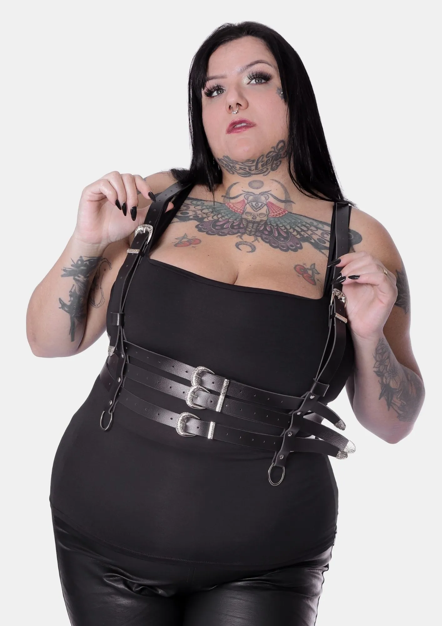 O Harness Triplo Fivelas Banshee é o acessório perfeito para completar seus melhores looks! Feito em material sintético de origem não animal que imita couro, o modelo consiste em um cinto com duas alças tipo suspensórios e aplicação de fivelas tipo western com ponteira. Seus materiais são de excelente qualidade e não descascam nem enferrujam, e seu design possui regulagens ao longo de toda peça para servir com exatidão uma gama ampla de corpos.