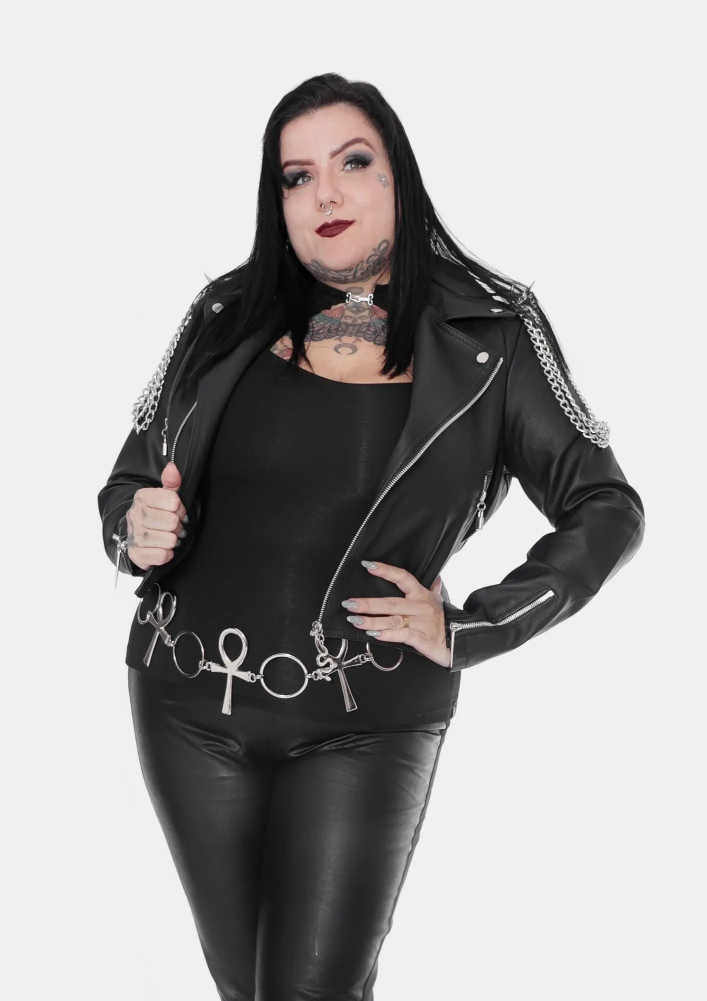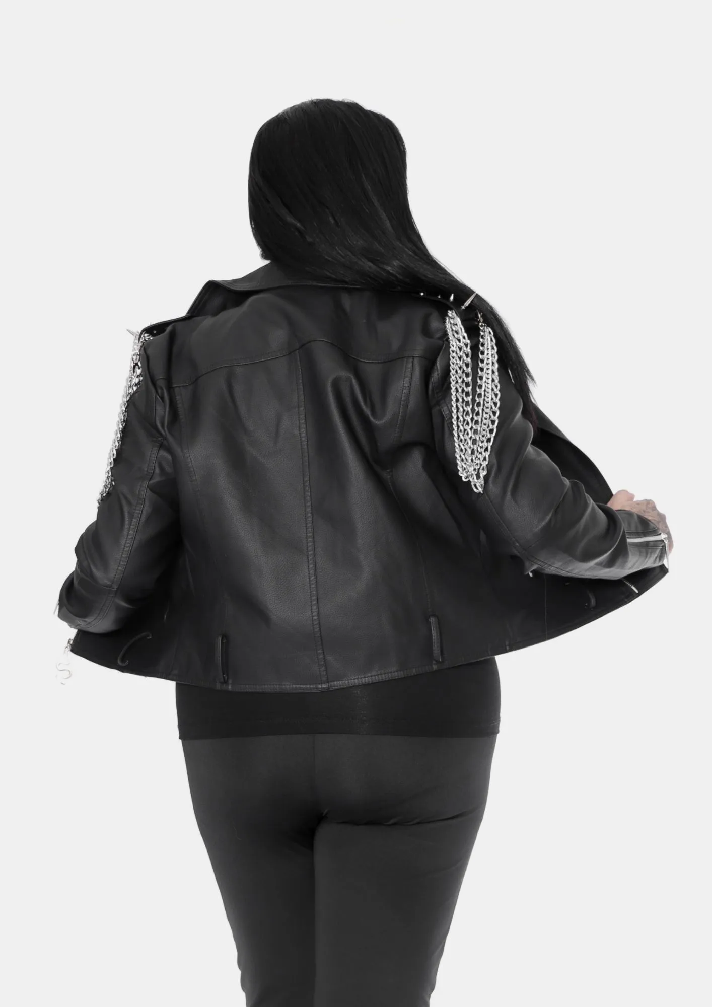 O modelo Perfecto é um verdadeiro ícone e não podia faltar uma versão com a alma da Sweet Sam! Confeccionada em material sintérico semelhante ao couro de excelente qualidade com forro acetinado, essa jaqueta foi inspirada nos visuais do clássico filme de vampiro Lost Boys. Os apliques de correntes e spikes nos ombros, os bolsinhos laterais com zíper e detalhes de cadeados, além do puxador de serpente exclusivo Sweet Sam, fazem dela uma peça única no seu armário.