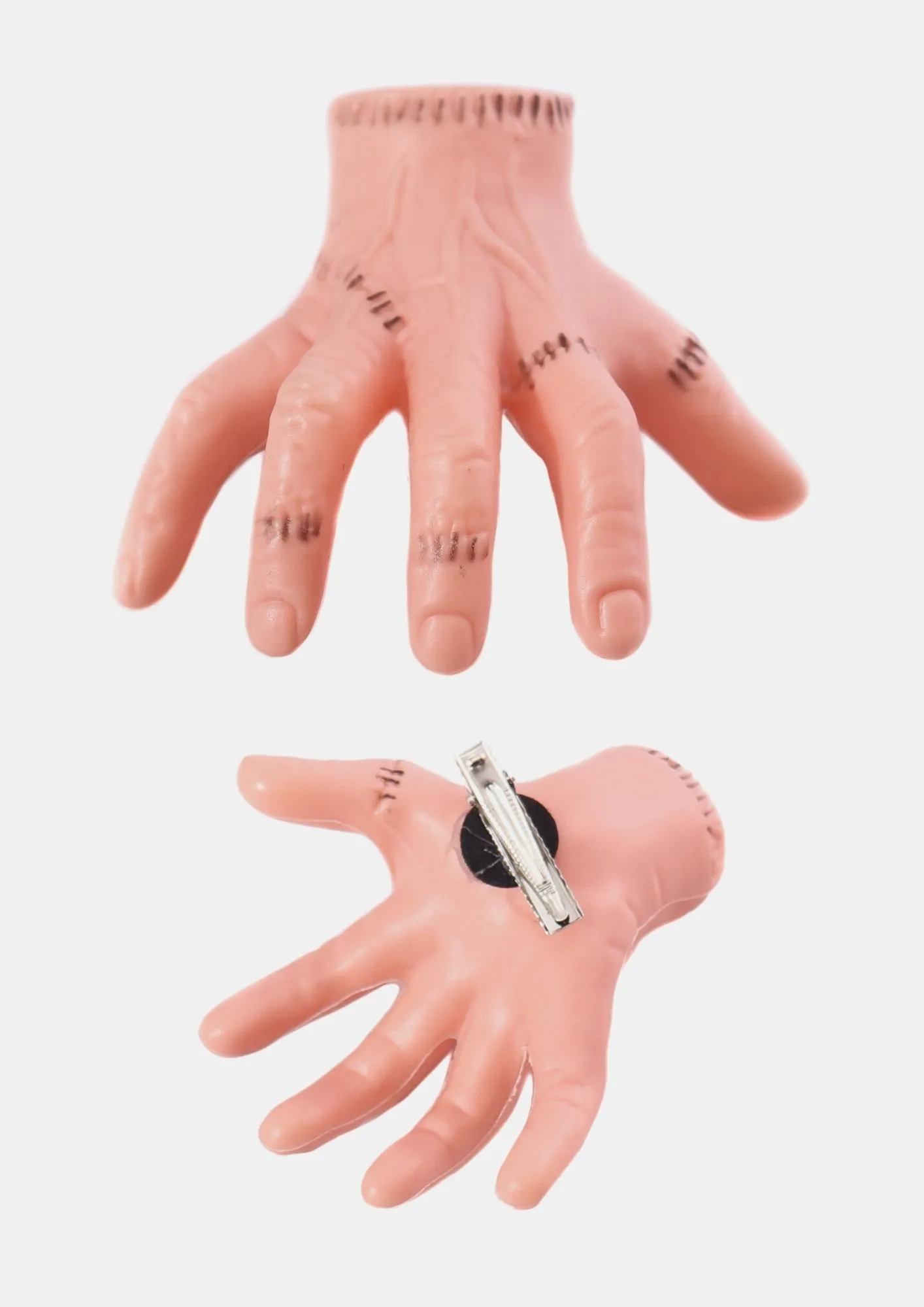 Se você é fã da família trevosa mais famosa do mundo, PRECISA desse ícone! Nossa Presilha Mãozinha é inspirada no icônico personagem da família Addams, feita em tamanho pequeno e com presilha tipo bico de pato perfeita para prender em roupas ou no cabelo. Se o seu look de halloween é Mortícia ou Wandinha, esse é o acessório PERFEITO!