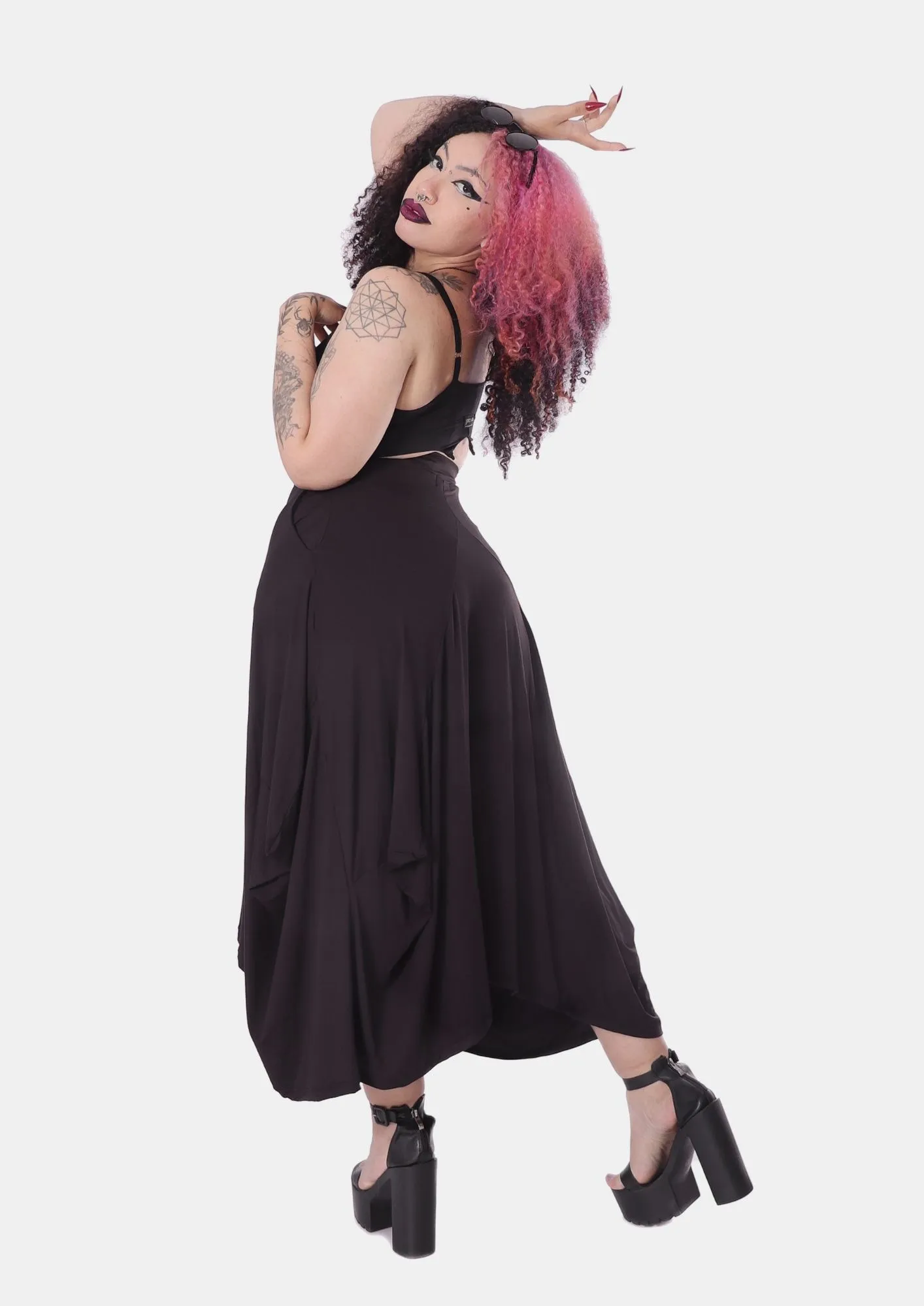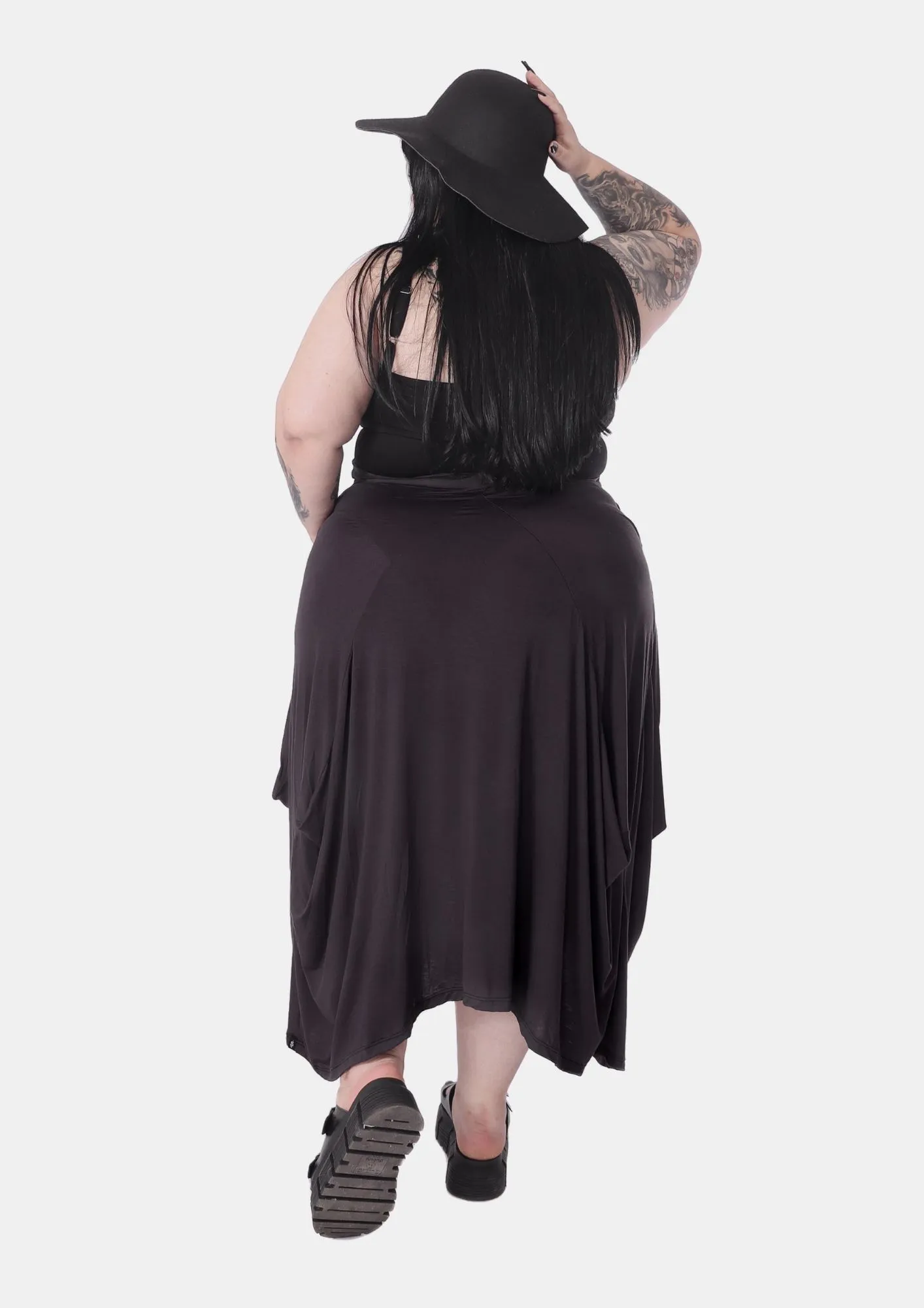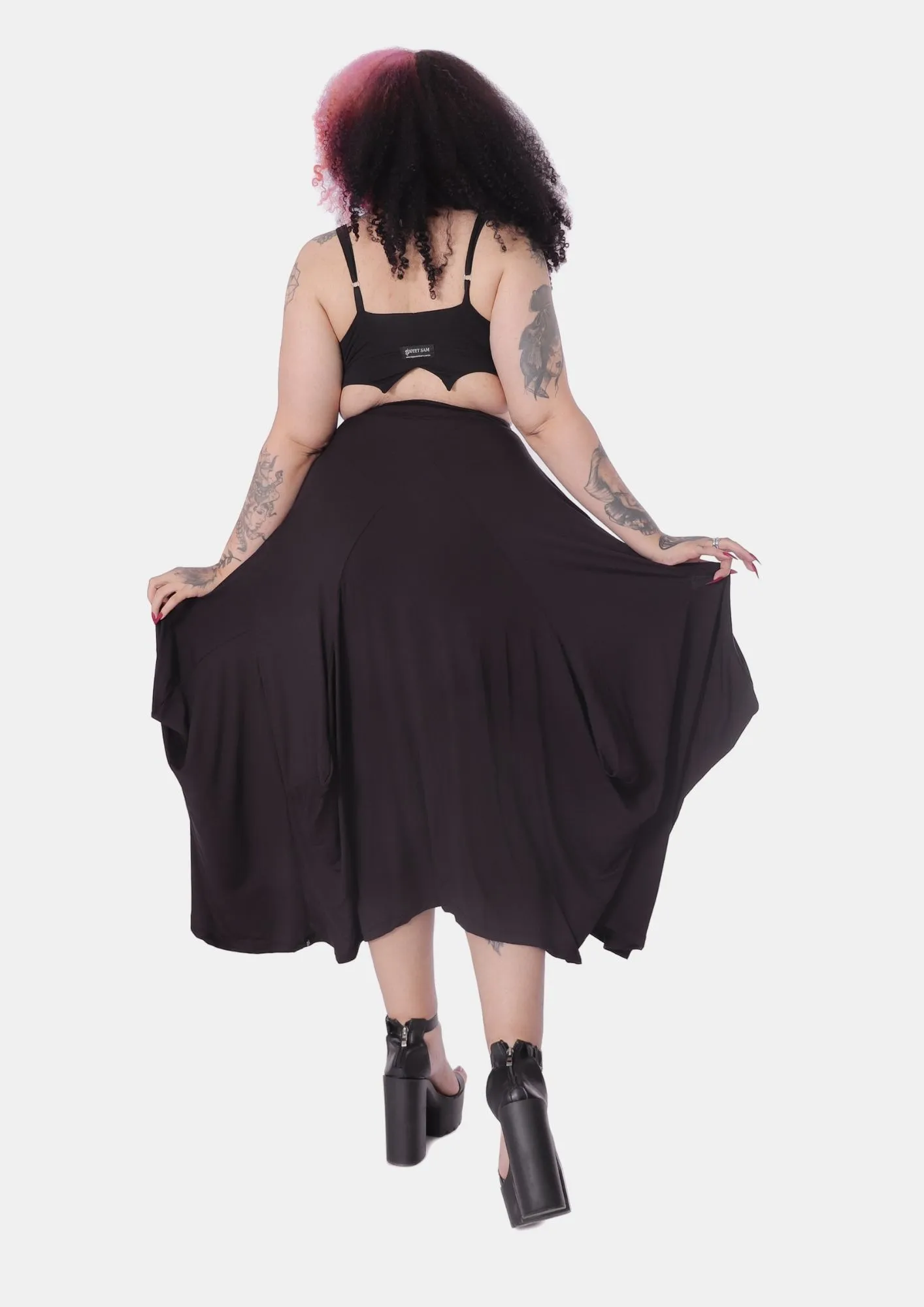 A Saia Hera é praticidade, leveza e movimento em uma peça só! Feita em malha Micromodal de excelente qualidade e garantindo sua leveza nos meses mais quentes do ano, possui design de pontas assimétricas esvoaçantes que conferem o ar místico da peça. O detalhe prático fica por conta dos bolsos funcionais, perfeitos para pequenos pertences. Uma peça especial, perfeita para todas as summer goths!