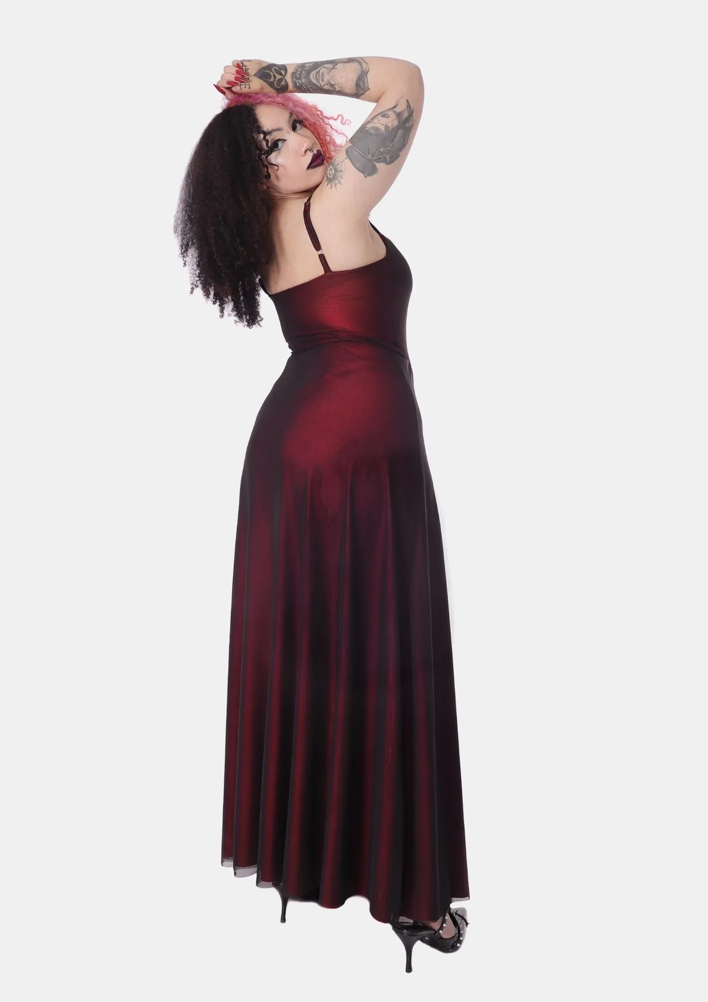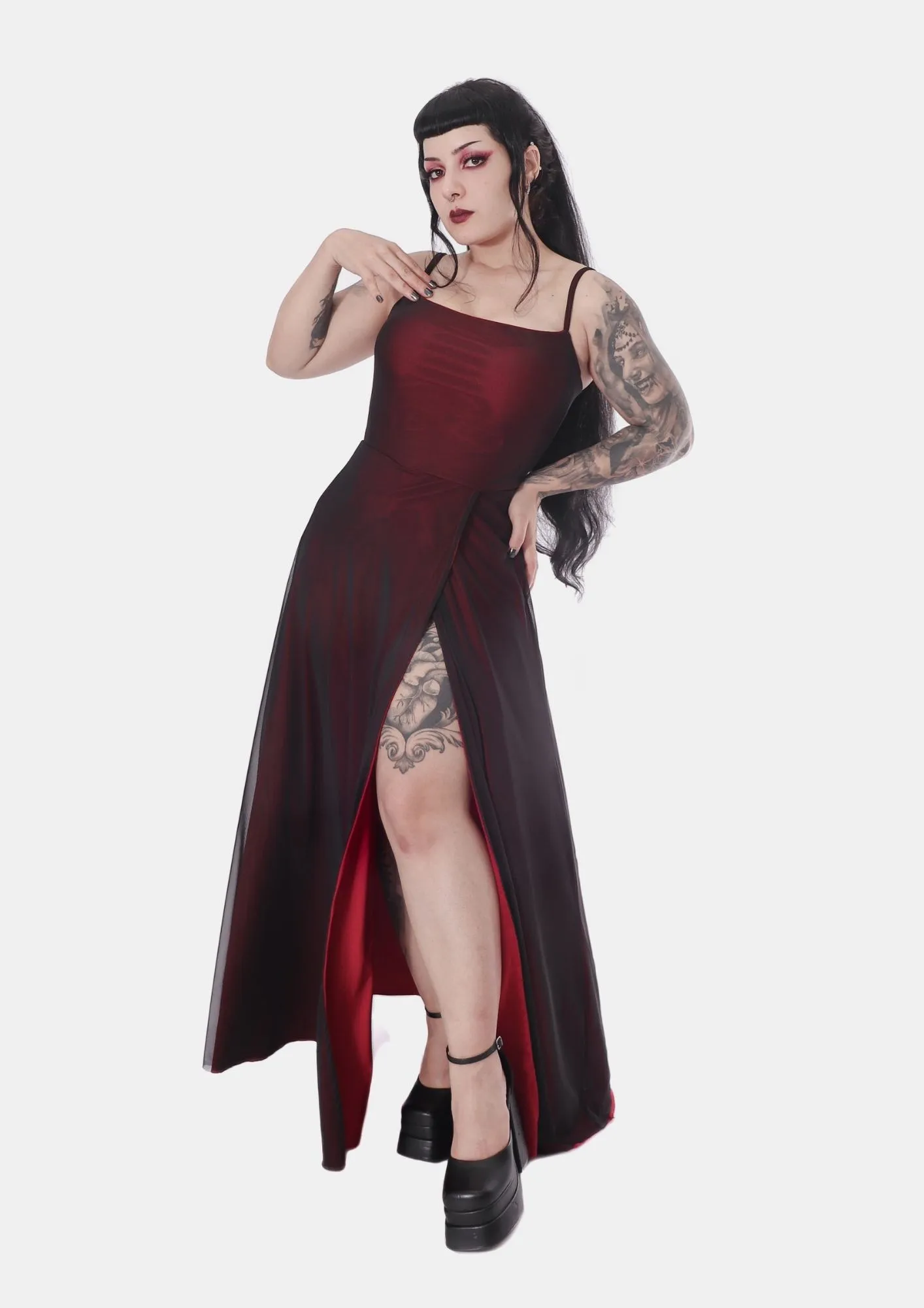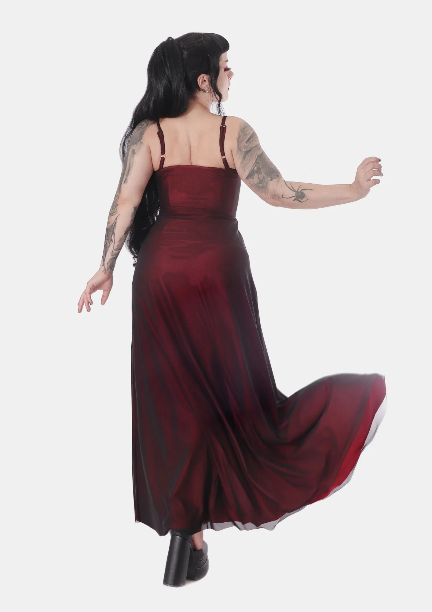 Um longo vermelho que combina sofisticação e presença, esse é o Vestido Eden. Possui alças reguláveis e uma fenda profunda que acrescenta movimento, além da camada de tule por cima acrescentar mistério. Inspirado na maçã proibida, ele é um vestido perfeito para quem deseja impressionar.