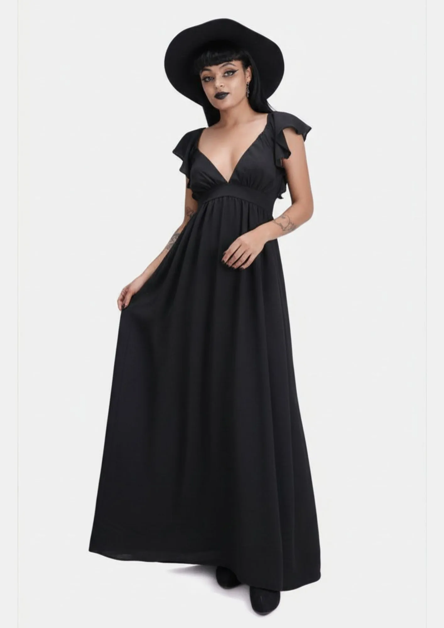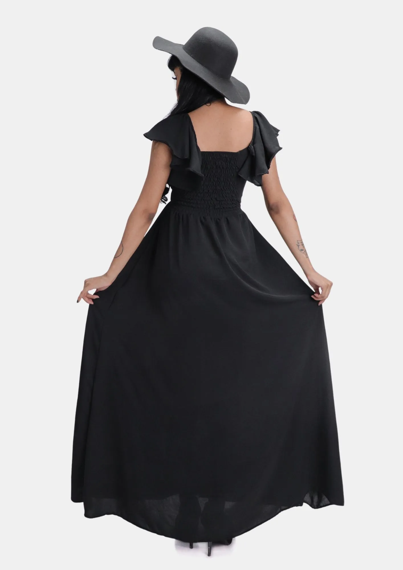 Produzido exclusivamente na Sweet Sam, o Vestido Neblina é feito em tecido leve e fluido com decote V profundo e manga sino nas alças. A cintura é marcada com elástico franzido nas costas e a saia godê longa tem volume e movimento que acompanham cada passo.