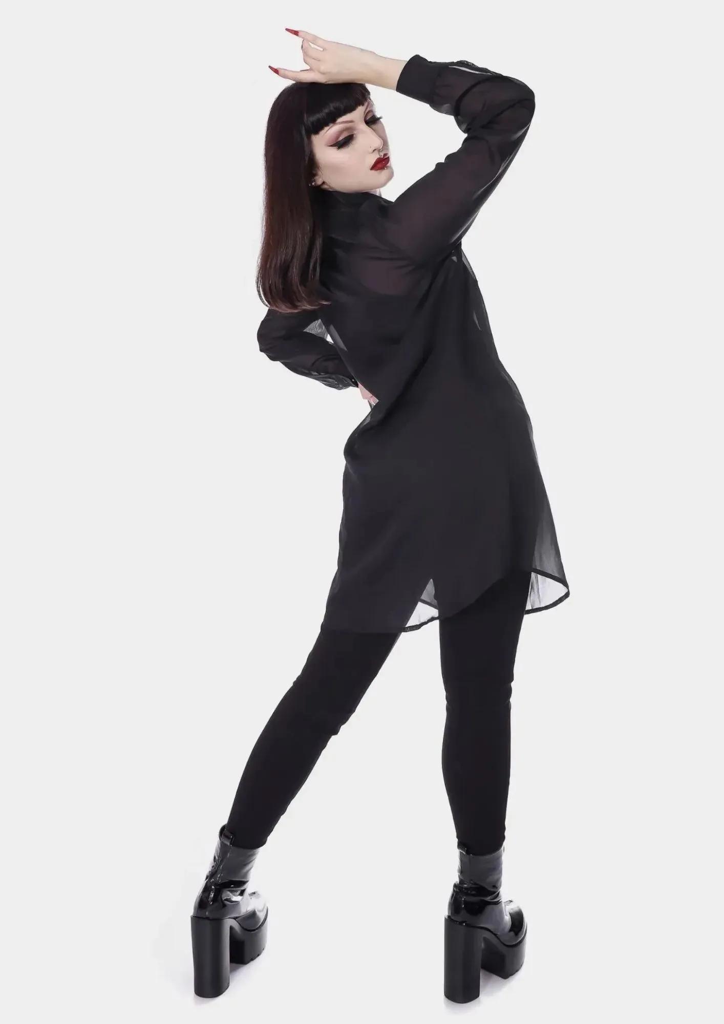 Sua modelagem clássica de camisa social ganha um ar diferenciado com a transparência e modelagem oversized, sendo perfeita para o ambiente de trabalho mas sem perder o estilo. Seu tecido é fresco, perfeito para os dias quentes. Versátil, ela pode ser usada tanto por dentro quanto por fora de calças e saias e funciona também como terceira peça ou com sobreposições de cintos, blazers e até corselets. É ou não é a definição de Corp Goth?