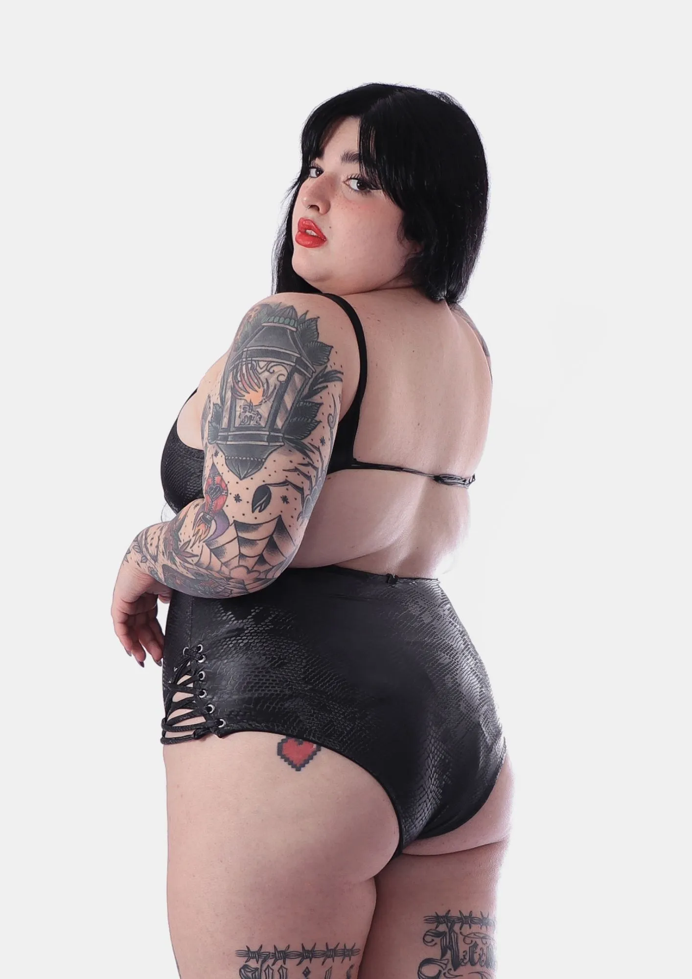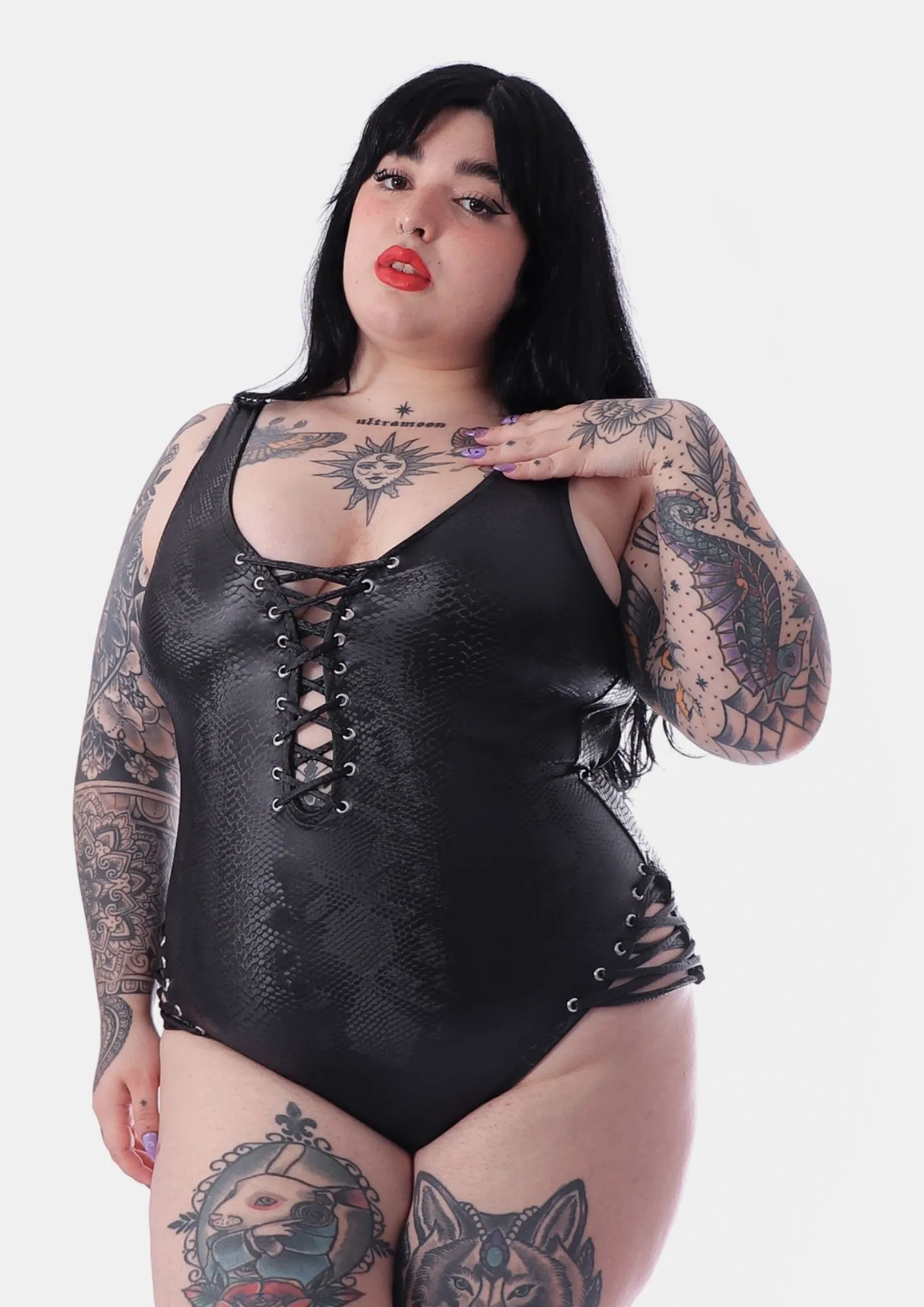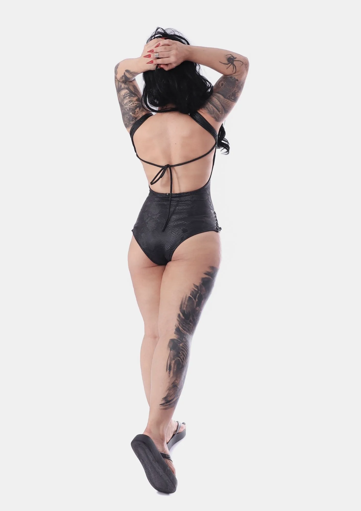 O Body Mamba Negra é o look essencial para mulheres fatais que desejam marcar presença. Com uma modelagem ousada, ele apresenta decote profundo, mini fendas nas pernas e costas abertas, realçando suas curvas de forma elegante e sedutora. Adornado com ilhós e amarrações, suas tiras reguláveis garantem um ajuste perfeito e confortável, proporcionando segurança durante o uso.