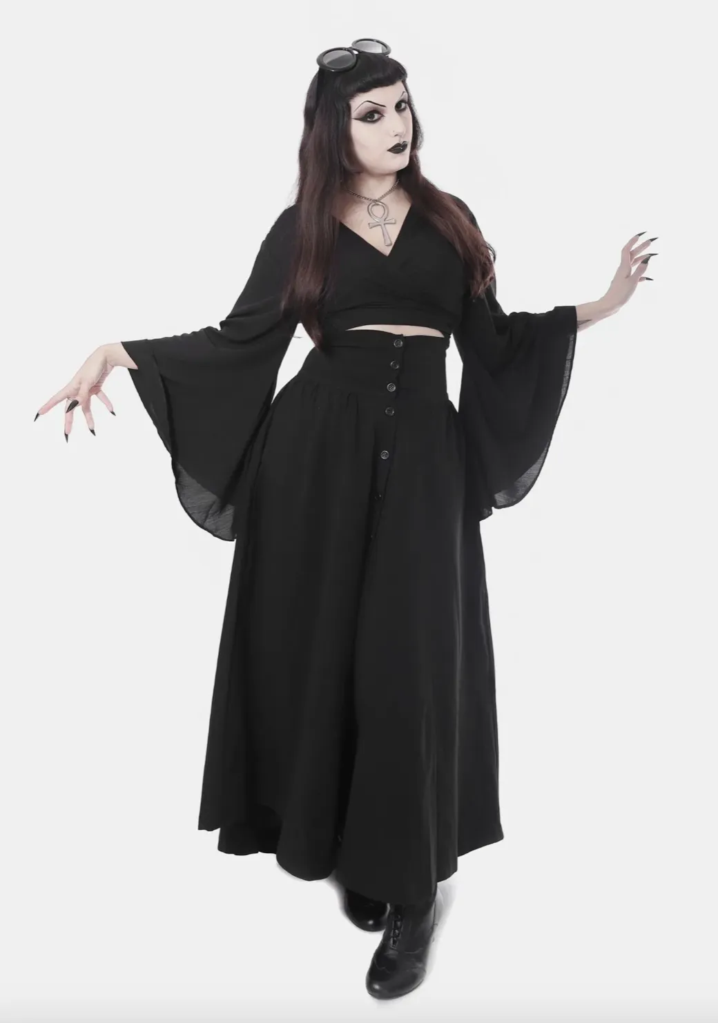 A Saia Bewitched é uma saia longa tipo mullet feita em bengaline com elastano, cós alto e largo, modelagem ampla e fecho em botões caseados. Uma peça versátil e elegante, que vai do trabalho ao passeio e eleva qualquer peça do seu guarda-roupa. Perfeita para as bruxonas!
