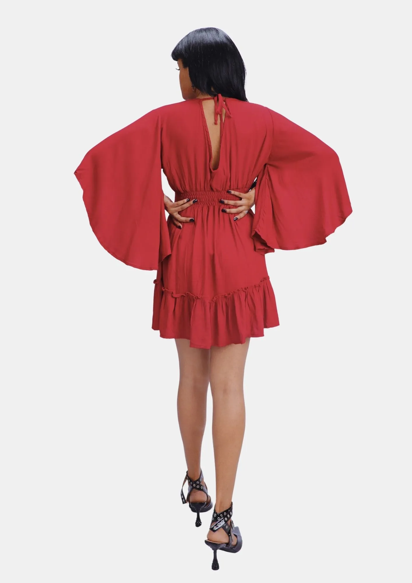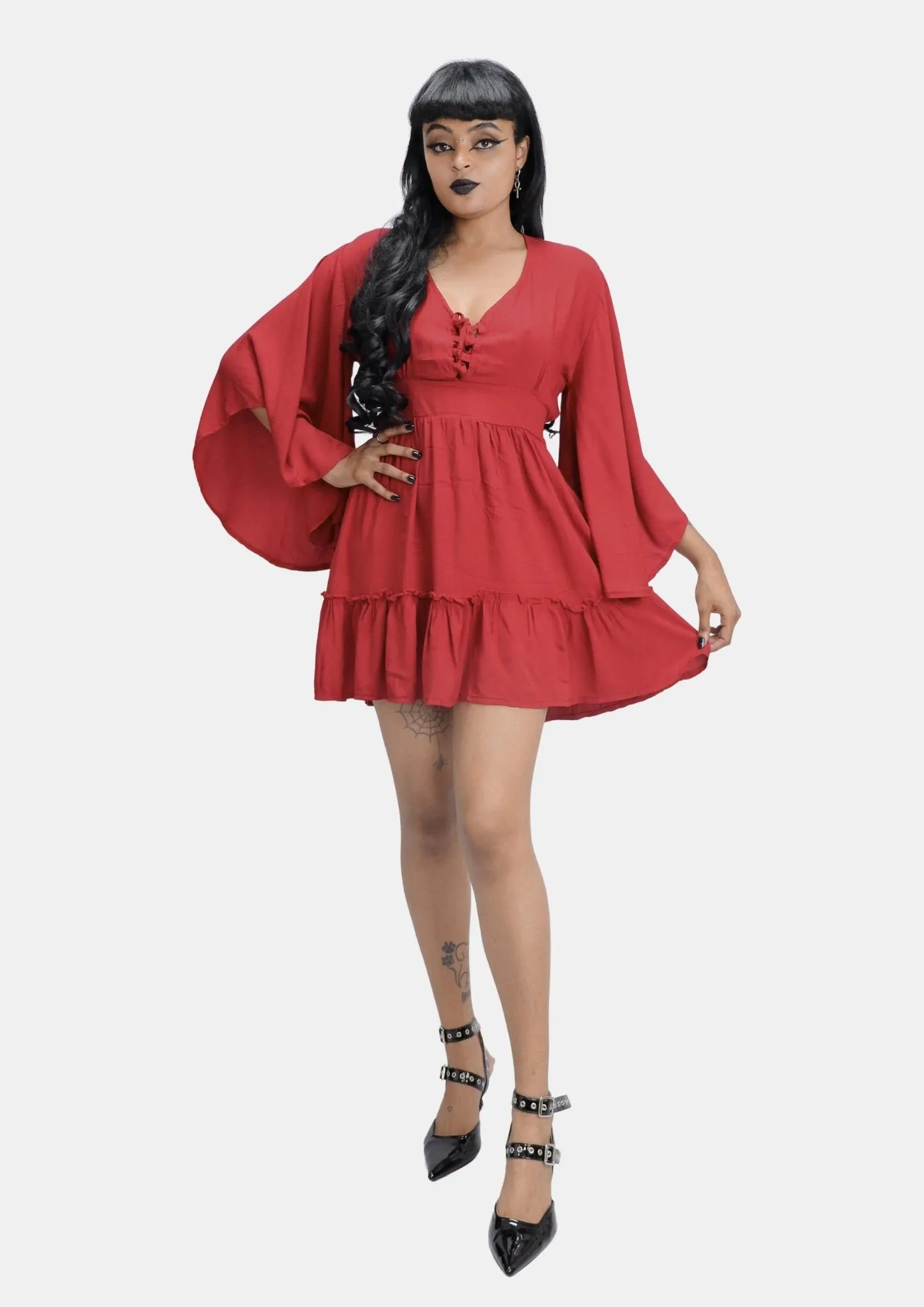 Feito em tecido leve e esvoaçante, o Vestido Elaine traz fluidez e charme pro seu guarda-roupa. Com mangas flare dramáticas, amarração frontal delicada e modelagem ampla, ele é perfeito para bruxas e vampironas que amam um visual vintage com atitude. O modelo é curtinho, confortável e conta com um fecho em laço nas costas, adicionando um toque de magia e feminilidade ao look.