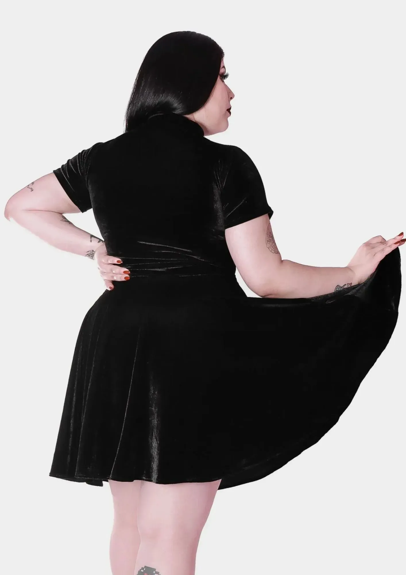 A parte de baixo é em godê duplo, conferindo um caimento mega rodado digno de uma boneca das trevas.