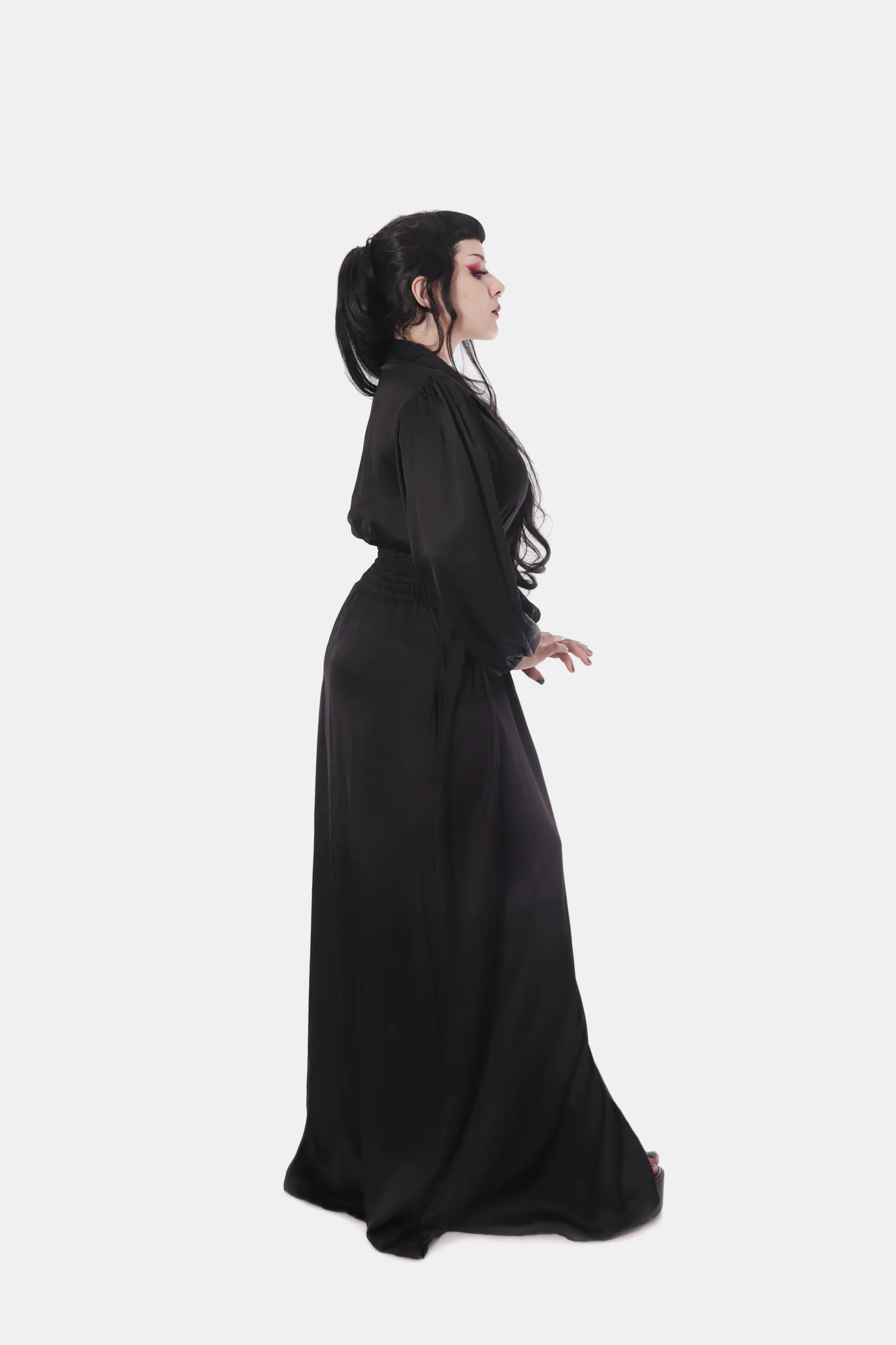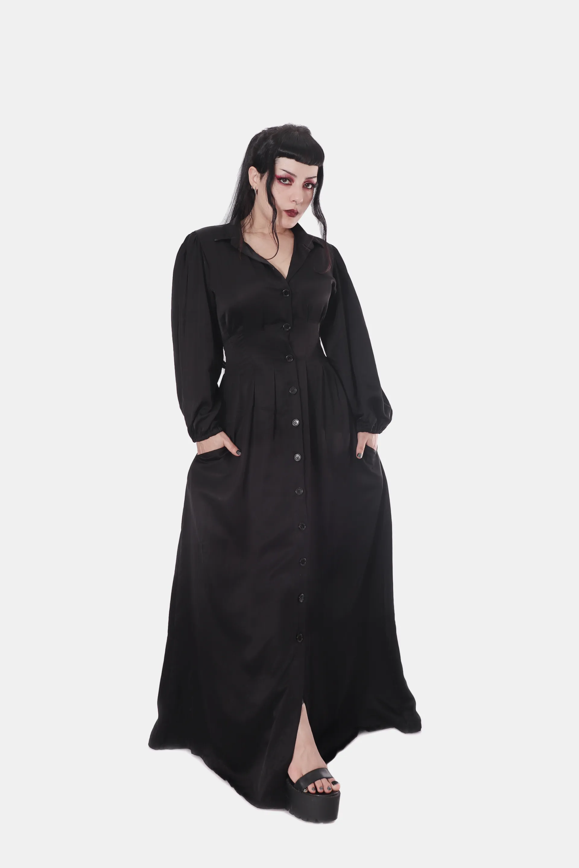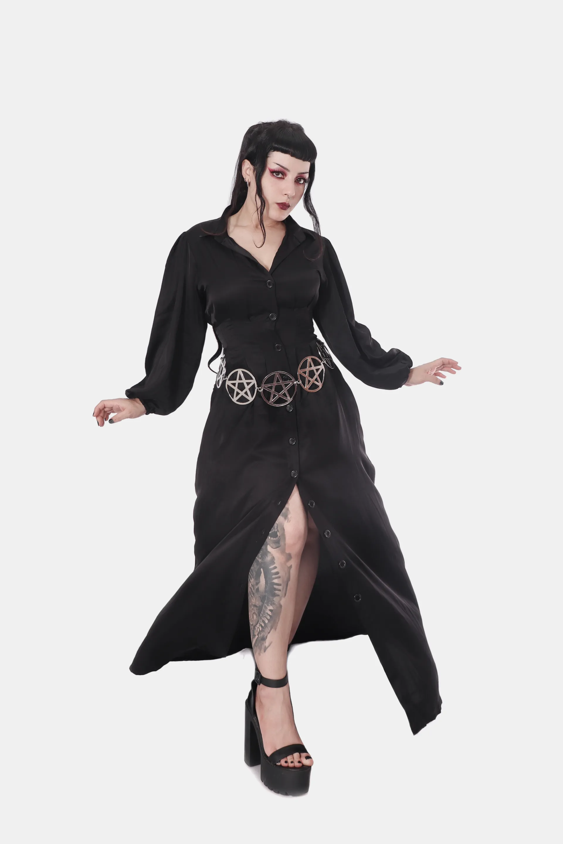 O PODER tem nome e é o Vestido Agares! Ele é longo, possui mangas longas tipo bispo, fecho em botões e cós elástico para maior conforto e facilidade ao vestir. Além disso, suas pences estratégicas na frente modelam o corpo de maneira elegante. Um vestido perfeito para as Corp Goth Girls!